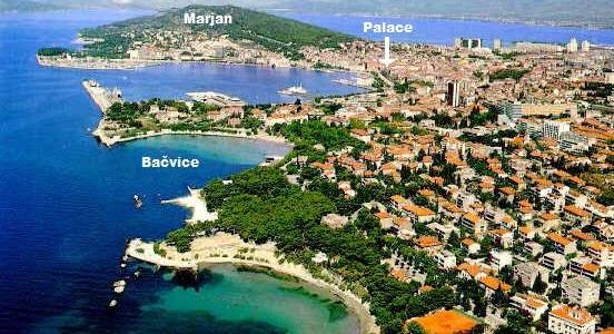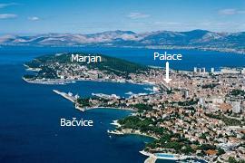 Zug, Bus und Fähre sind auf der östlichen Seite des Hafens, 5min zu Fuß von der Altstadt entfernt. Die meisten der besten Restaurants und die großen Hotels sowie Strände und das Nachtleben liegen östlich des Hafens, entlang der Bacvice bis hin zur Trstenik Bucht.
